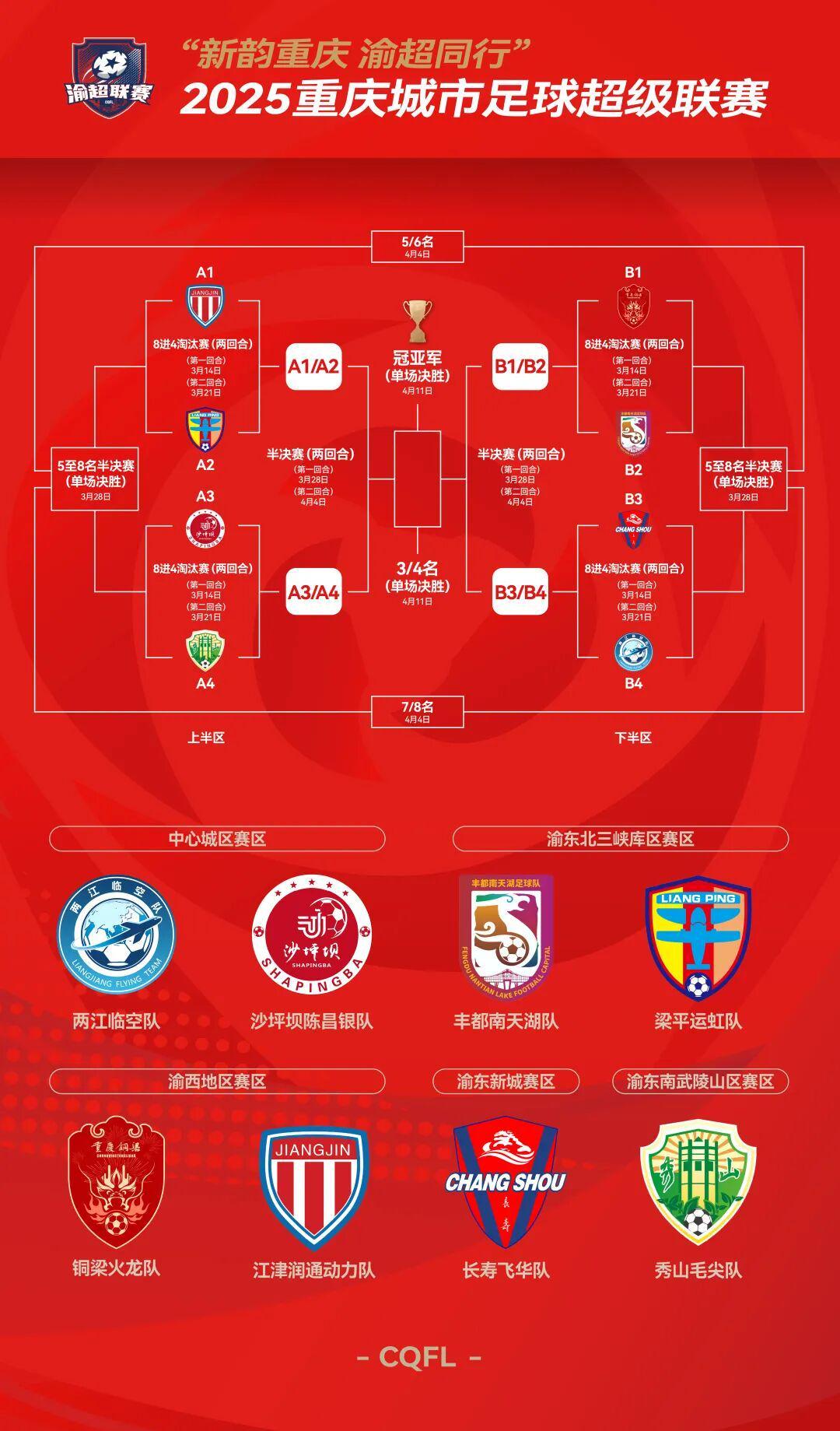 根据赛程安排,渝超总决赛将于3月14日正式燃情开赛,4月11日迎来冠亚军终极争夺。此次晋级总决赛的8支队伍各具实力,全面覆盖全市五大赛区:中心城区赛区的两江临空队、沙坪坝陈昌银队;渝西地区赛区的铜梁火龙队、江津润通动力队;渝东新城赛区的长寿飞华队;渝东北三峡库区赛区的丰都南天湖队、梁平运虹队;渝东南武陵山区赛区的秀山毛尖队,八支劲旅将同台竞技,向着本赛季渝超最高荣誉发起冲击。